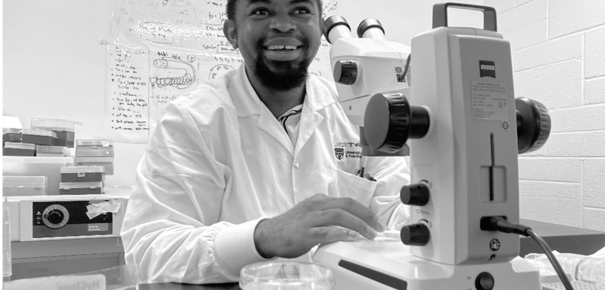 Lloyd Fotso est un jeune chercheur en biologie cellulaire et moléculaire du département de biologie médicale à l’Université du Québec à Trois-Rivières. Il étudie la régulation des cellules souches pour comprendre l’origine des cancers en utilisant un vers transparent appelé C. elegans. Lloyd se demande comment ces cellules peuvent être responsables d’un cancer.